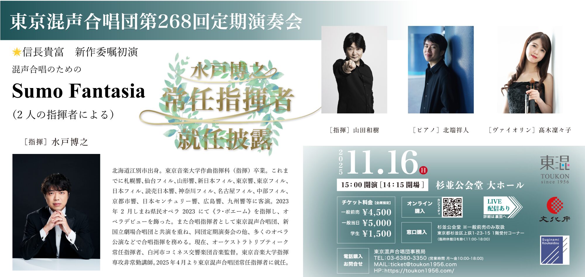 2025年10月15日 / 最終更新日時 : 2025年10月15日 admin お知らせ 信長貴富 委嘱作品タイトル発表! 来る11/16(日)、第268回定期演奏会にて初演されます、信長貴富氏による委嘱作品のタイトルが以下に決定いたしました🎉 混声合唱のための《Sumo Fantasia》 奉納相撲を題材とした作品で、 […]
